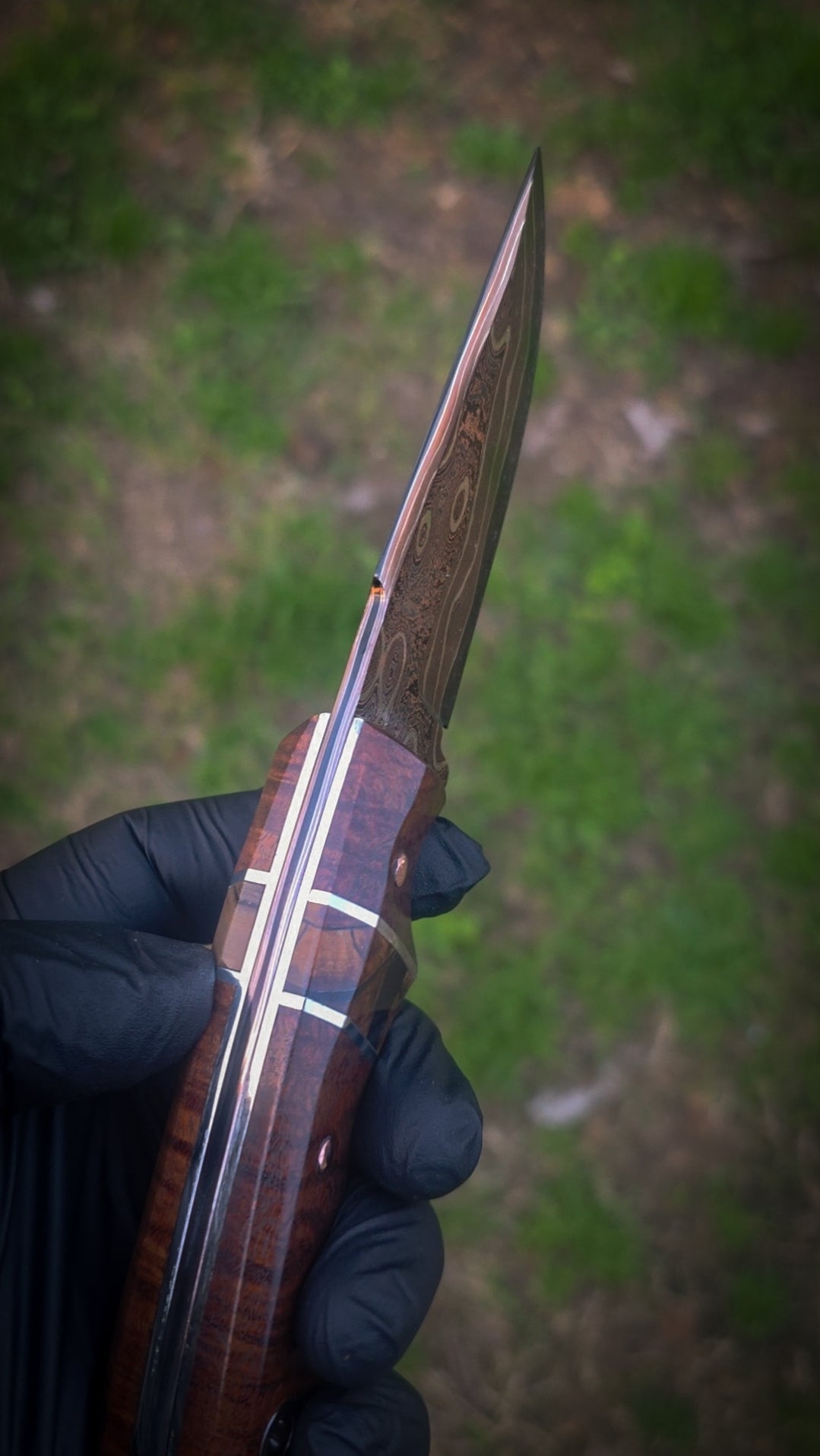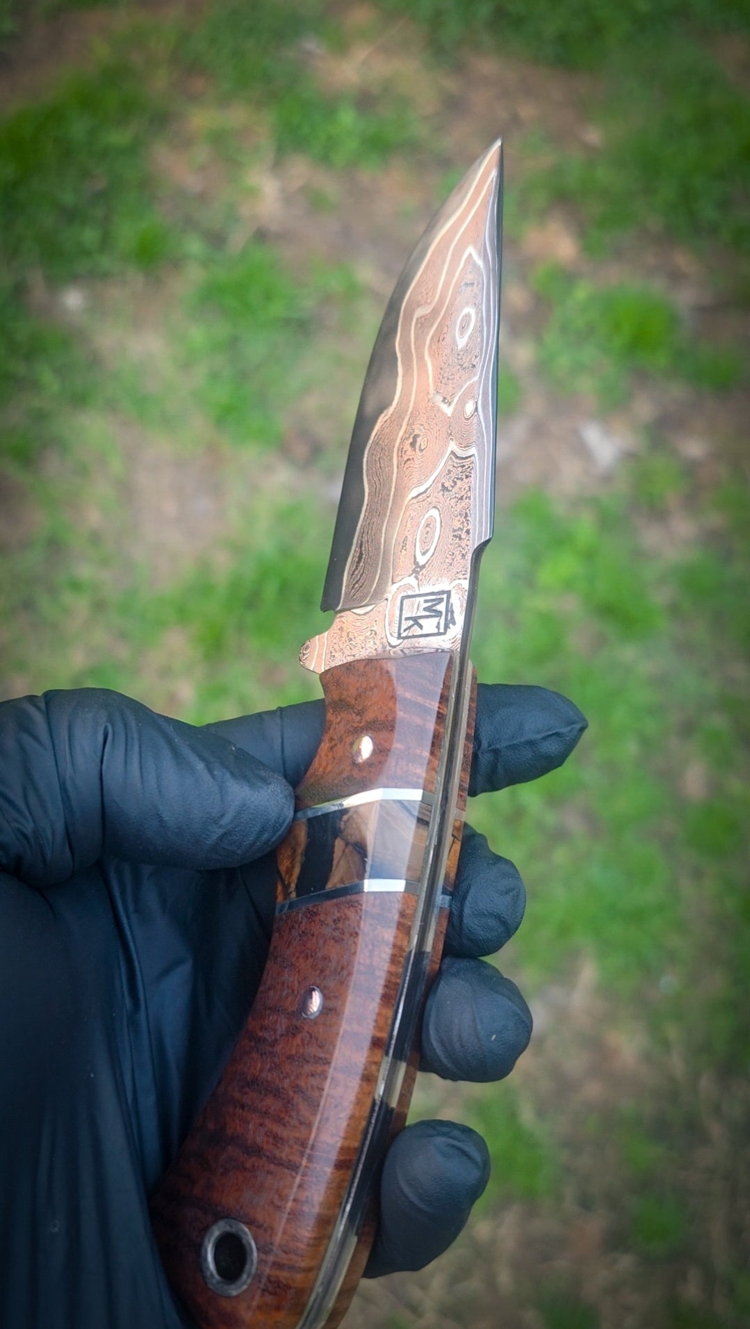 The blade is made from BakerForge Raindrop Tsunami Mai featuring layers of copper damascus and nickel over an 80crv2 core. Meticulously brought to a high shine and polish that leaves even the black areas reflective.