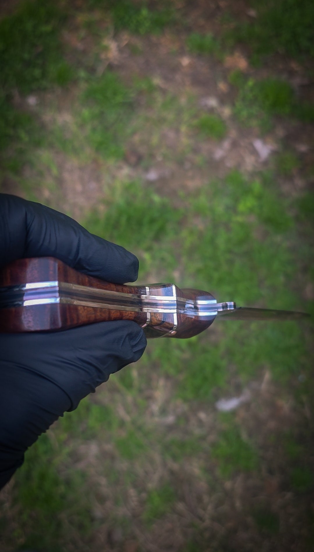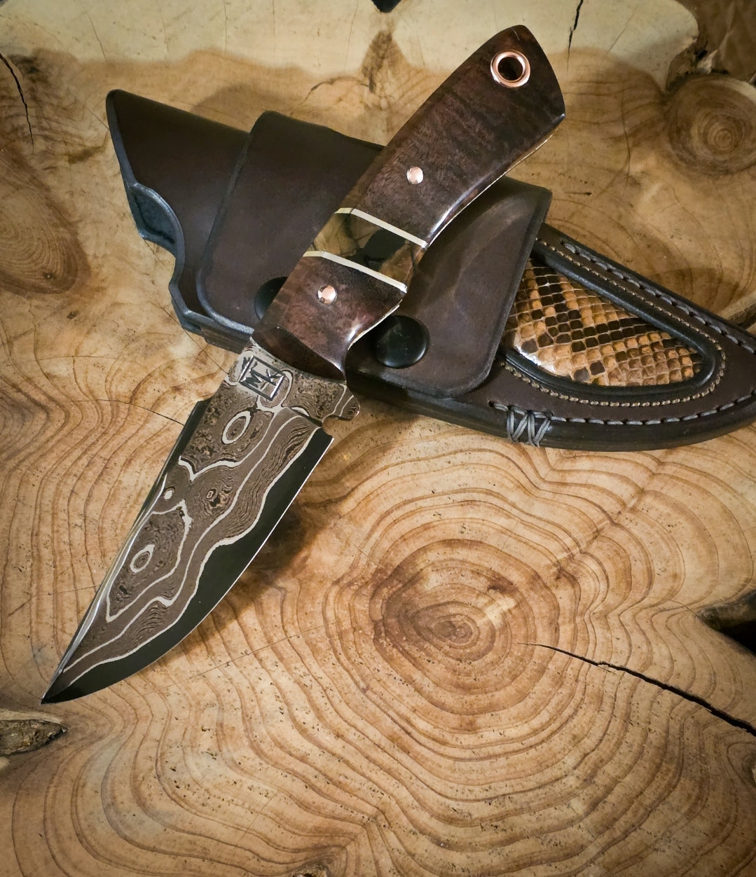 The handle is a multi piece design made from Western Myall sourced in Australia, Polished Stainless accents and liners with a Mammoth Ivory spacer. The pins are hand domed copper and copper lanyard hole.