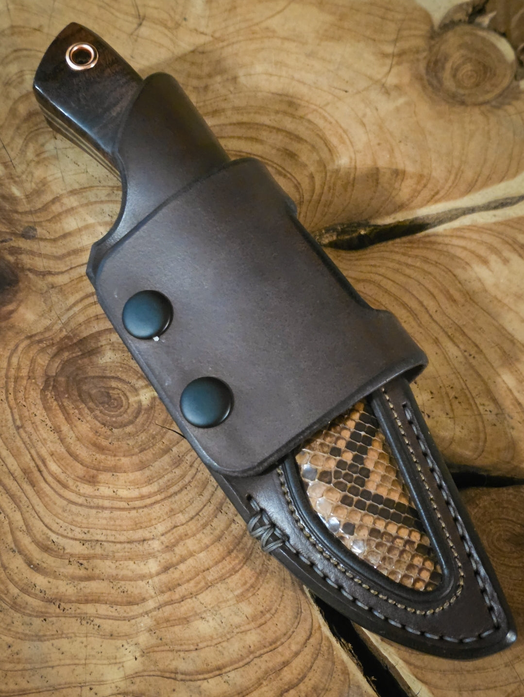 The sheat is custom made for this knife via Guster Leather and is ambi carry, vertical or horizontal. It features real snake skin insert as well.
